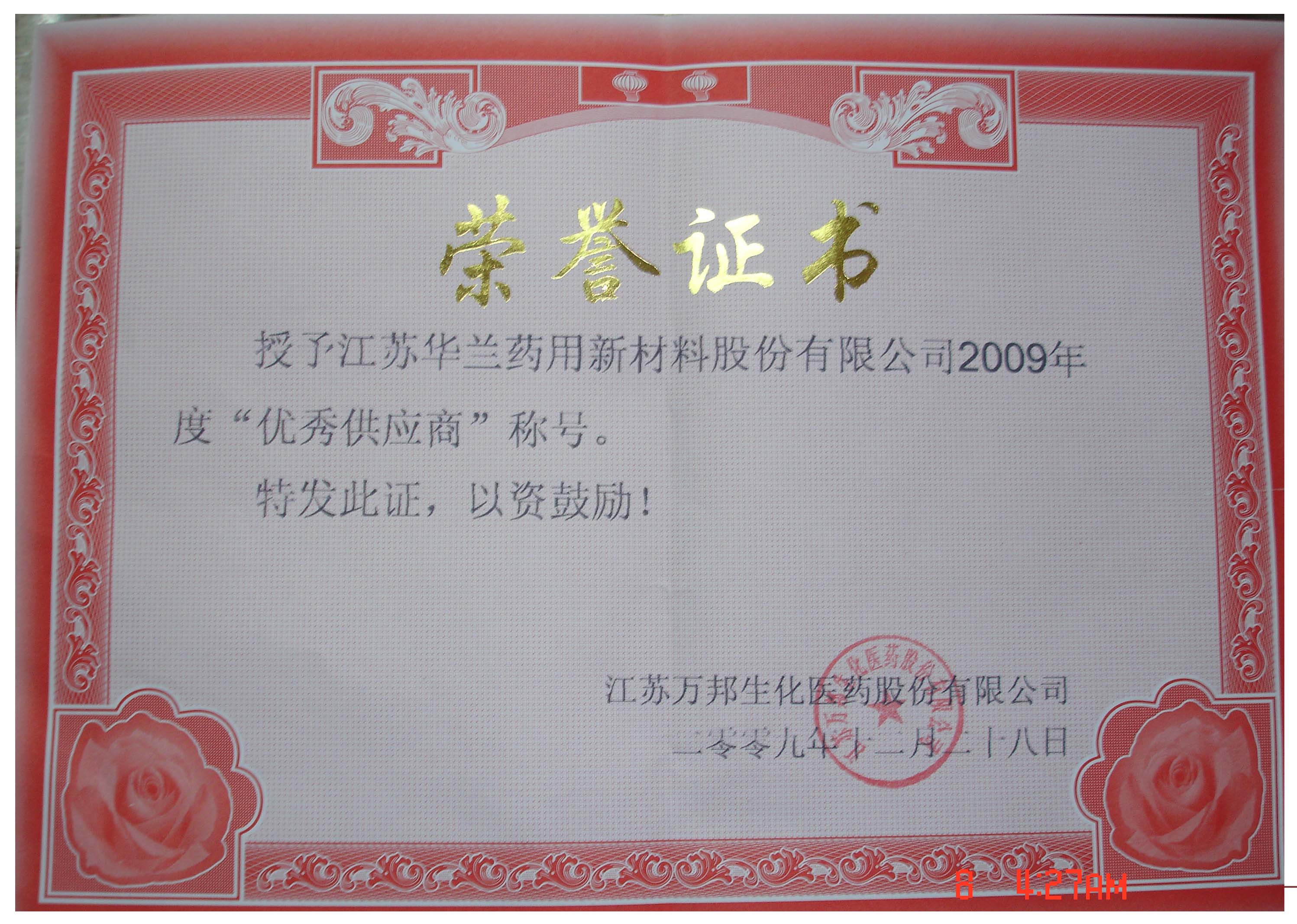 華蘭獲“2009優(yōu)秀供應(yīng)商”榮譽