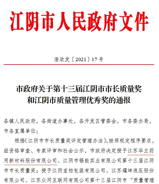 公司榮獲第十三屆“江陰市市長質(zhì)量獎”。2021年開始的“十四五”時期,形成以國內(nèi)大循環(huán)為主體、國內(nèi)國際雙循環(huán)相互促進的新發(fā)展格局。華蘭把握國家“十四五”時期新發(fā)展階段的新機遇和新挑戰(zhàn),始終把華蘭制造向華蘭創(chuàng)造轉(zhuǎn)變、把華蘭速度向華蘭質(zhì)量轉(zhuǎn)變、把華蘭產(chǎn)品向華蘭品牌轉(zhuǎn)變”。堅持精耕實做,強化創(chuàng)新、管理、融合、投資、責任意識,為開啟華蘭打造世界領(lǐng)先企業(yè)的新篇章加油!